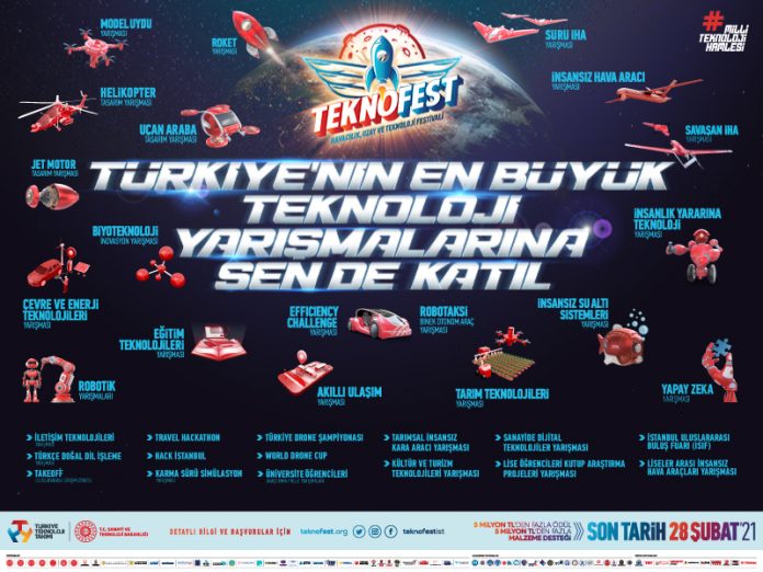 21-26 Eylül tarihleri arasında İstanbul’da gerçekleşecek olan TEKNOFEST’e başvurular “https://teknofest.org/yarismalar.html” adresinden gerçekleştirilebiliyor.
