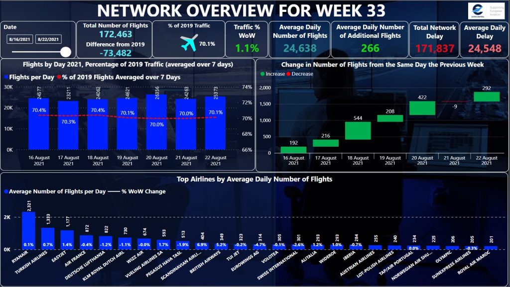 Eurocontrol 2021 yılının 33’ncü haftasına ilişkin Avrupa genelindeki hava yolu trafiği güncel verileri paylaşıldı.