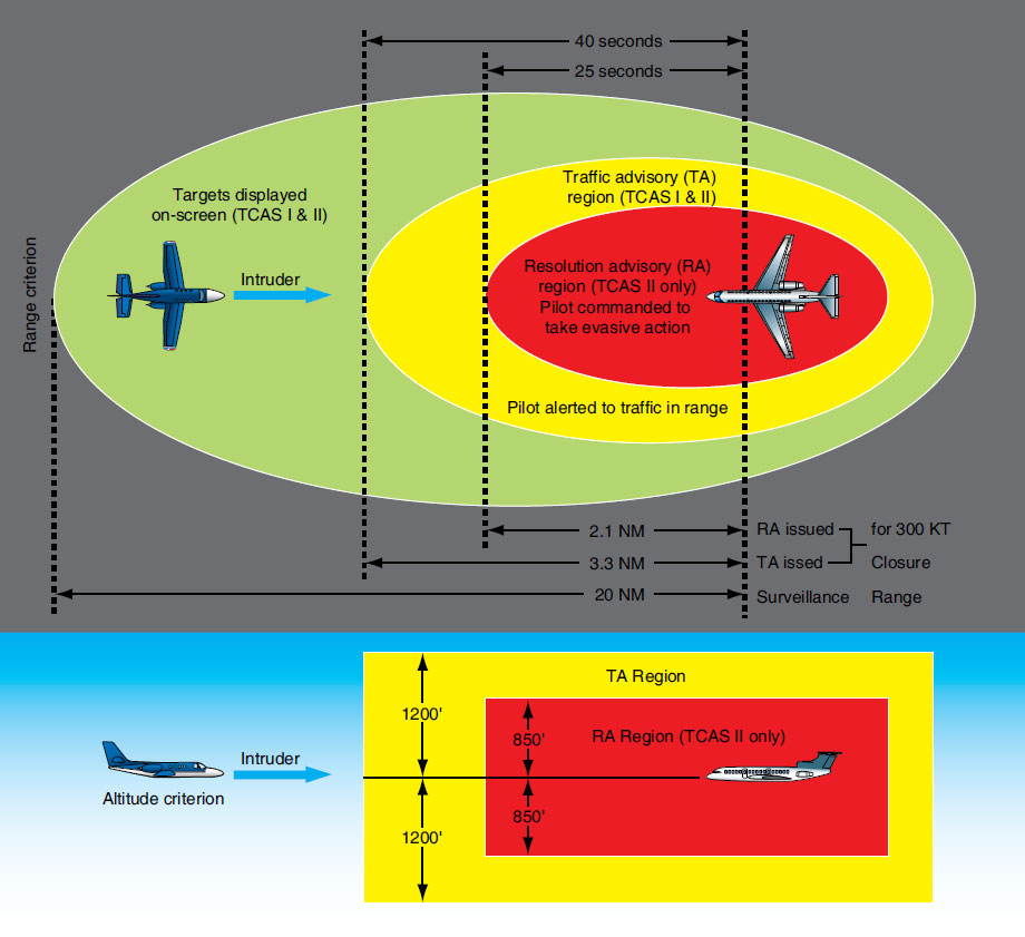 United ile TWA’nin uçaklarının çarpıştığı 1956 Büyük Kanyon üzerindeki kazanın ardından bu yönde çalışmalara başlanıldı. İki uçak arasındaki mesafeyi sürekli olarak hesaplayan, bu bilgileri yakınındaki uçak ile paylaşarak kaza ikaz sistemi TCAS geliştirildi. TCAS yoğun hava trafiğindeki olası yaklaşmaları ve çarpışmaları önleyebilecek donatıya sahip bir teknolojidir. Fakat bunu yalnızda dikey olarak sağlayabilmektedir.